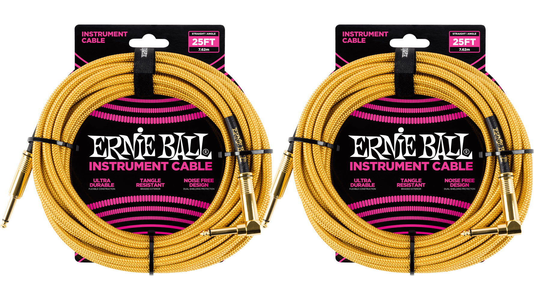 Ernie Ball 25ft Braided Straight Angle Inst Cable Gold Gold