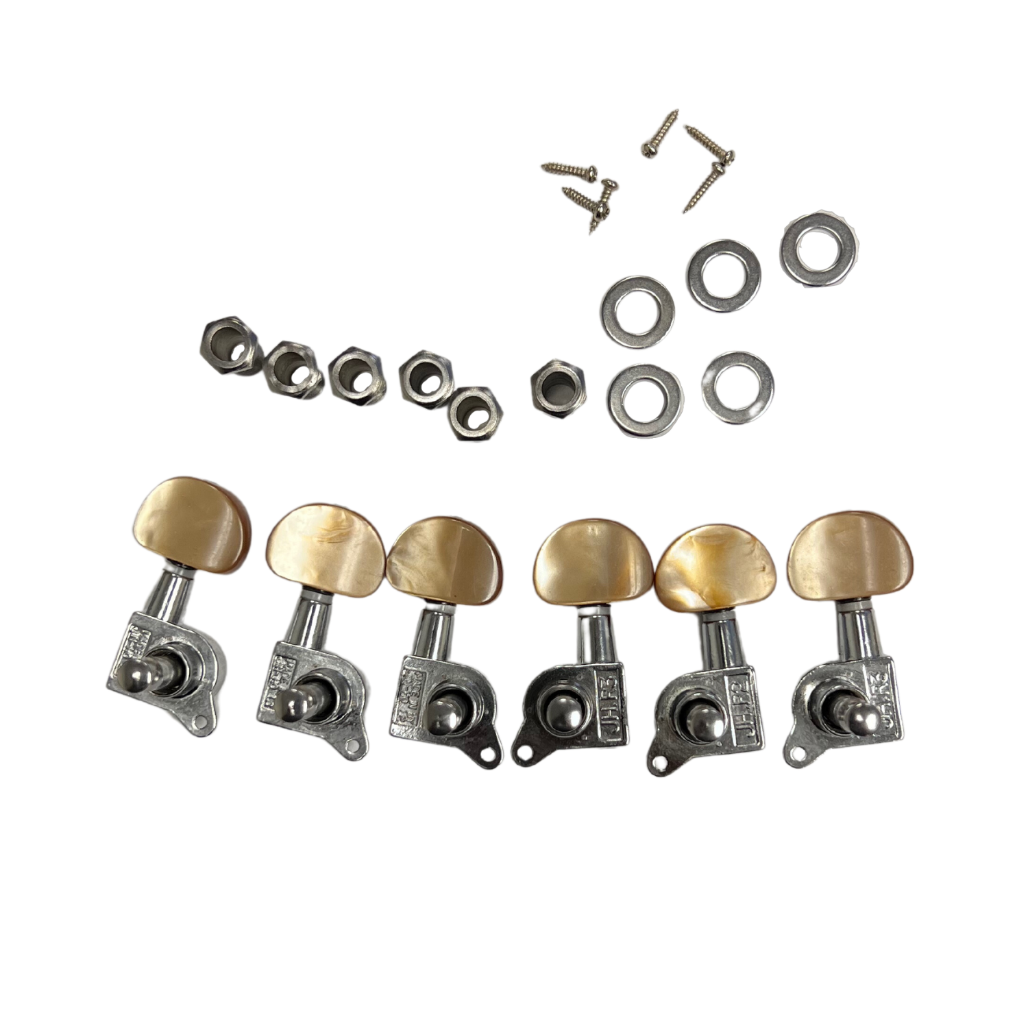 For a great option to build out an inexpensive project or to finish a parts guitar, look no further than the 3L+3R Tuning Machine Head, Chrome, Amber Pearl Button, J-P3-CR.