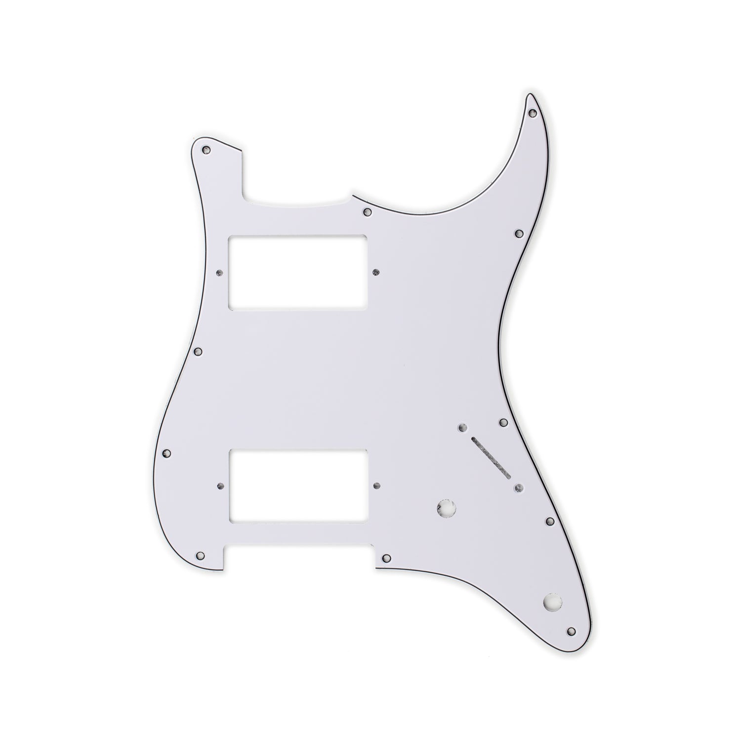 - 11 mounting-screw holes seat the pickguard firmly against the Strat top