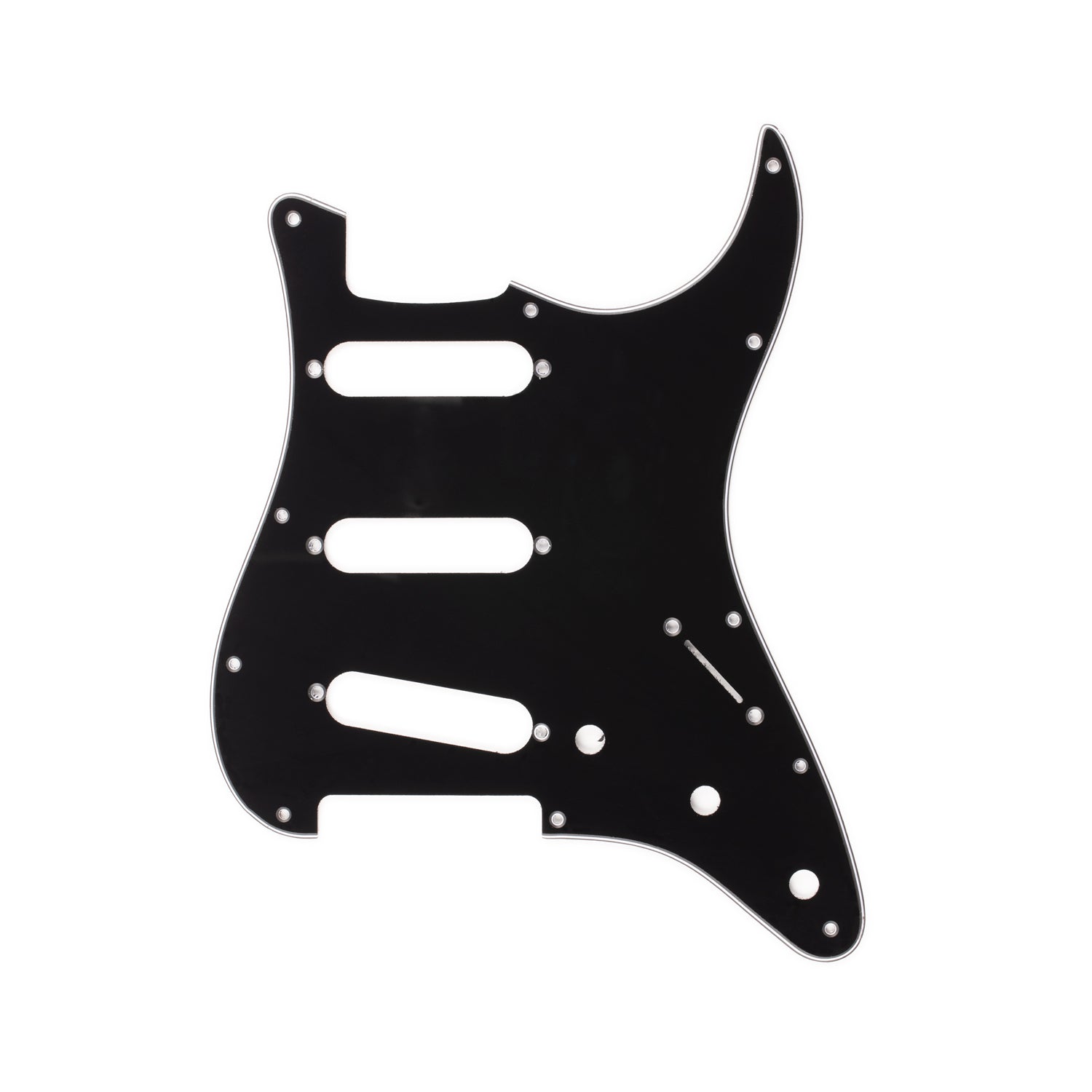 - 11 mounting-screw holes seat the pickguard firmly against the Strat top