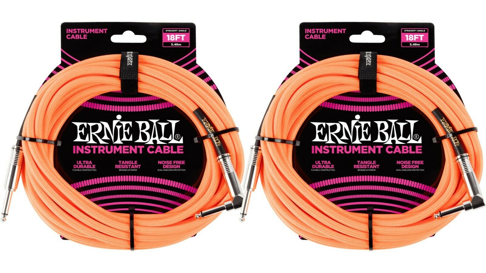 Ernie Ball 18ft Braided Straight Angle Inst Cable Neon Orange 2 Pack
